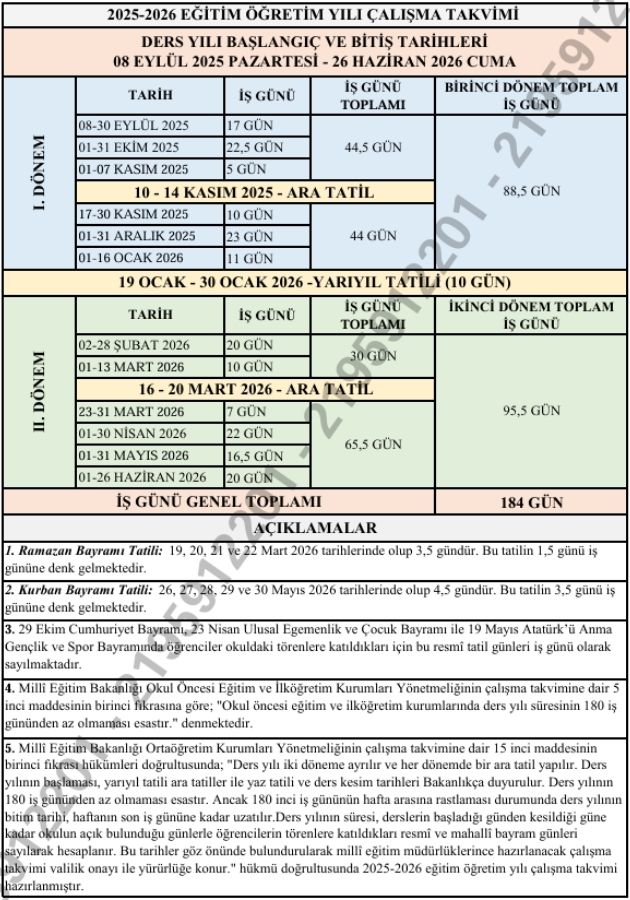 “Ders yılı iki döneme ayrılır ve her dönemde bir ara tatil yapılır. Ders yılının başlaması, yarıyıl tatili, ara tatiller ile yaz tatili ve ders kesim tarihleri Bakanlıkça duyurulur. Ders yılının 180 iş gününden az olmaması esastır. Ancak 180’inci iş gününün hafta arasına rastlaması durumunda ders yılının bitim tarihi, haftanın son iş gününe kadar uzatılır. Ders yılının süresi, derslerin başladığı günden kesildiği güne kadar okulun açık bulunduğu günlerle öğrencilerin törenlere katıldıkları resmî ve mahallî bayram günleri sayılarak hesaplanır. Bu tarihler göz önünde bulundurularak millî eğitim müdürlüklerince hazırlanacak çalışma takvimi valilik onayı ile yürürlüğe konur.”
